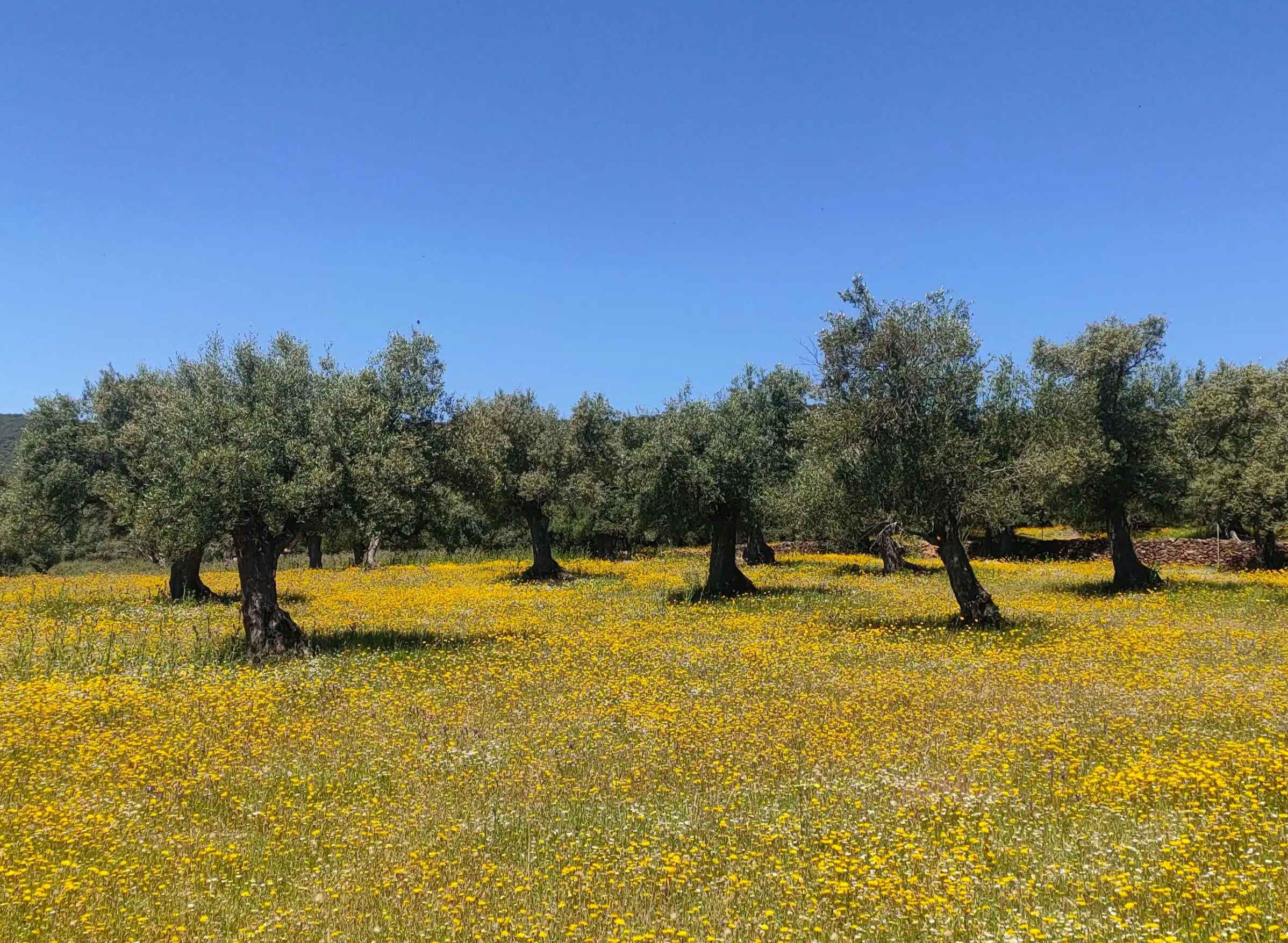 Notre oliveraie de montange se situe dans le Parc Naturel et Réserve de la Biosphère Sierra de Aracena et Picos de Aroche, au nord de Huelva.Fruit d’un héritage familial, nos près de 3.000 oliviers vivent sur de petits minifundios de montagne qui totalisent environ 25 hectares. Ce sont des parcelles dispersées, souvent en pente, où chaque arbre demande un soin particulier.La culture se fait en secano, sans irrigation : les oliviers reçoivent seulement l’eau de la pluie. Ce choix, c’est notre manière de respecter la ressource en eau et de laisser la terre suivre son propre rythme. Notre production est 100 % biologique certifiée depuis 1999, et nos brebis entretiennent l’oliveraie en fertilisant le sol et en maintenant l’équilibre de ce paysage vivant.